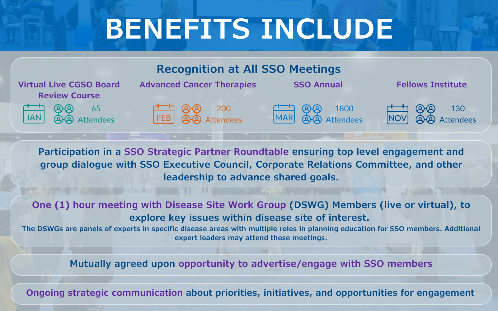 SSO offers exhibiting and sponsorship opportunities at each of our annual meetings including Advanced Cancer Therapies held in February, Fellows Institute held in November, and the SSO Annual Meeting held in March.